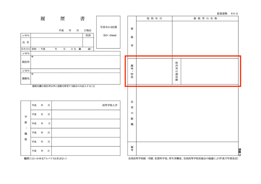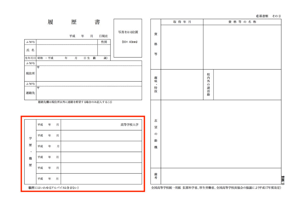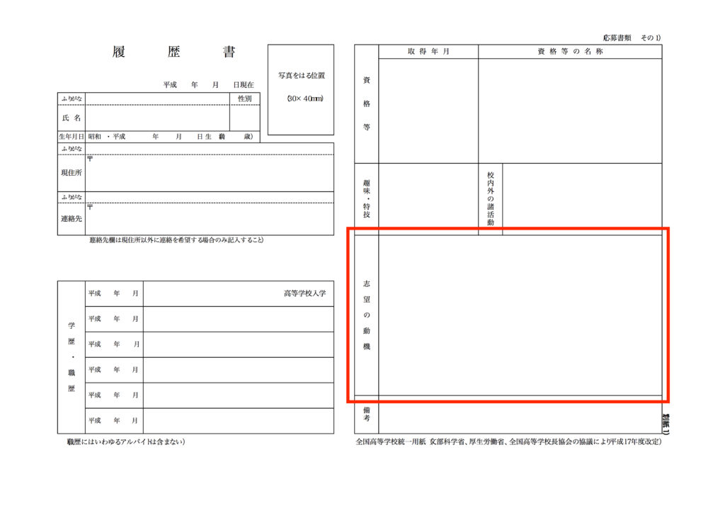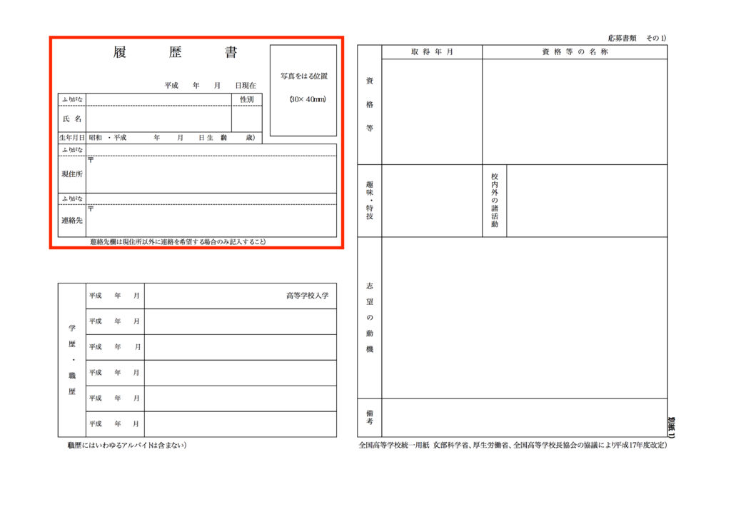 履歴書に関しては国からフォーマットが指定されています(全国高等学校統一用紙)。